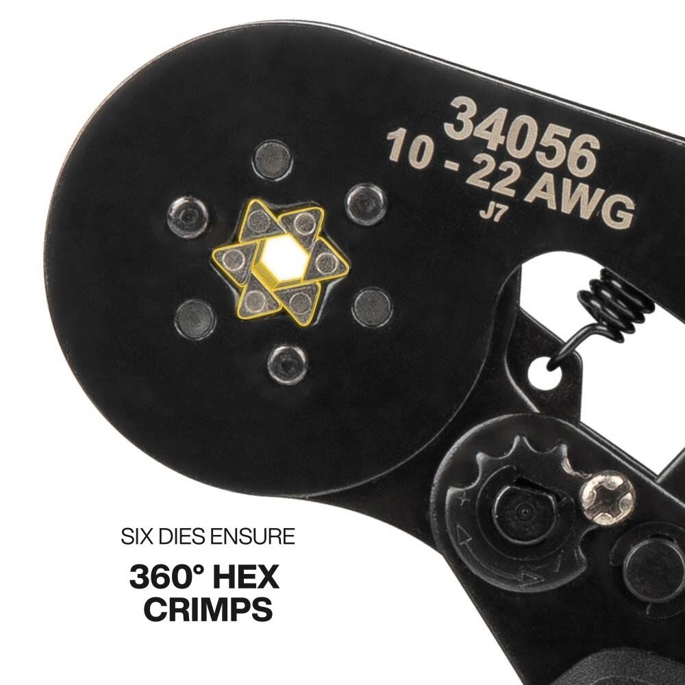 - Six precision dies create secure, 360-degree hex crimps