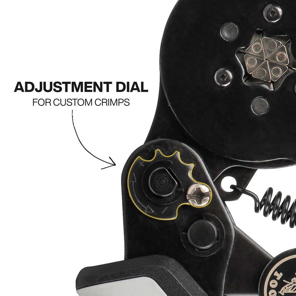 The Klein Tools Ratcheting Ferrule Hex Crimper Set delivers precision and versatility with the Ratcheting Hex Ferrule Crimper (Cat. No. 34056), 1200 terminals for 10-22 AWG wires, and a soft case for organized storage. Its ratchet ensures consistent hex crimps, while six precision dies create durable 360-degree connections. Ergonomic grips and an adjustable dial provide fine-tuned accuracy, combining comfort, efficiency, and reliability in one comprehensive set.