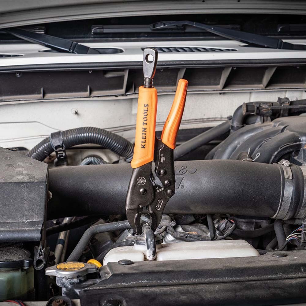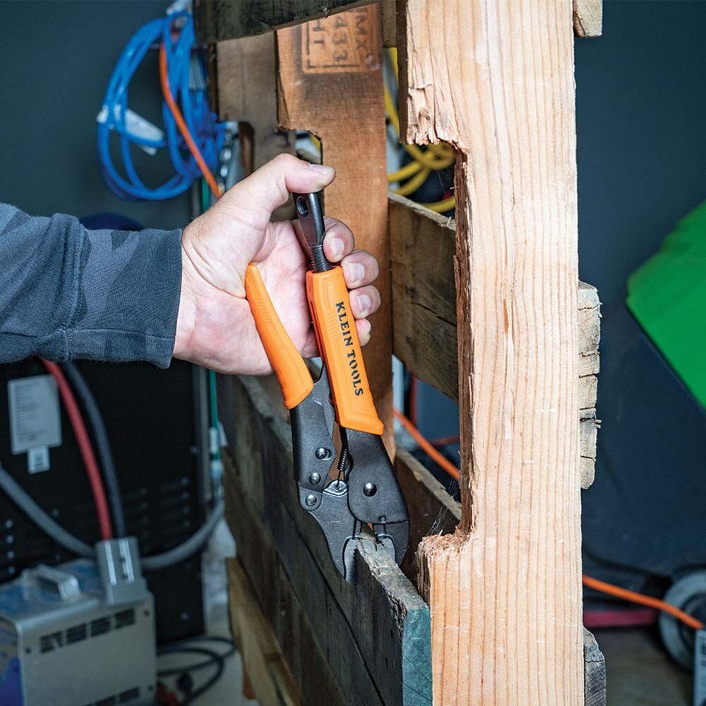 The Klein Tools' Locking Pliers Set includes the 6-Inch C-Clamp Locking Pliers (Cat. No. 38630), 6-Inch Long Nose Locking Pliers (Cat. No. 38611), and 10-Inch Curved Jaw Locking Pliers (Cat. No. 38602). Engineered for maximum locking force, they are ideal for clamping, turning round objects, and working in confined areas. Features include an intuitive thumb knob for easy adjustments, lever release design for pinch-free use, and durable rust-resistant coating for longevity.