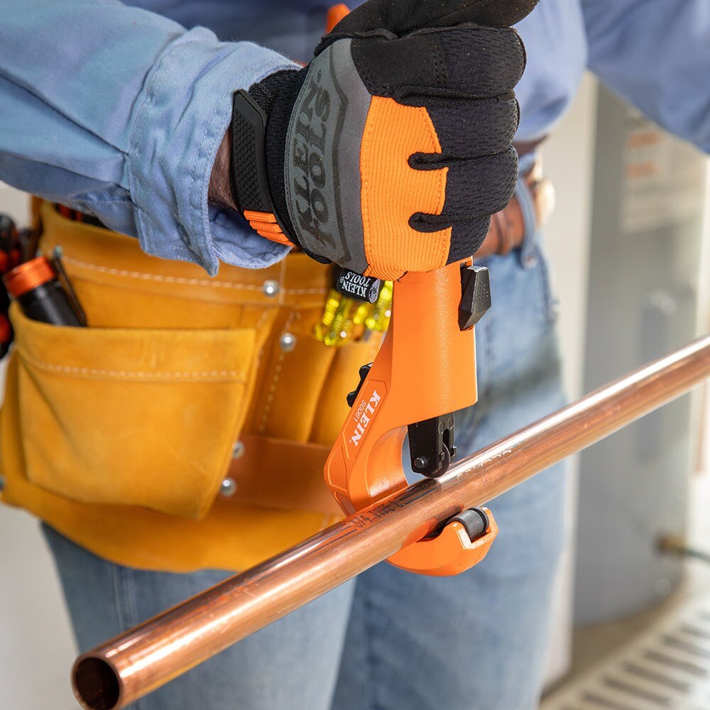 The Klein Tools Quick-Adjust Tubing Cutter is designed to cut copper and aluminum tubing. The fast-action button easily adjusts cutting capacity, ranging from 1/8-Inch to 1-5/8-Inch (3 to 41 mm) O.D; up to 1-1/2-Inch (40 mm) I.D. Equipped with a retractable telescoping deburring tool, post-cut clean up is quick and seamless.