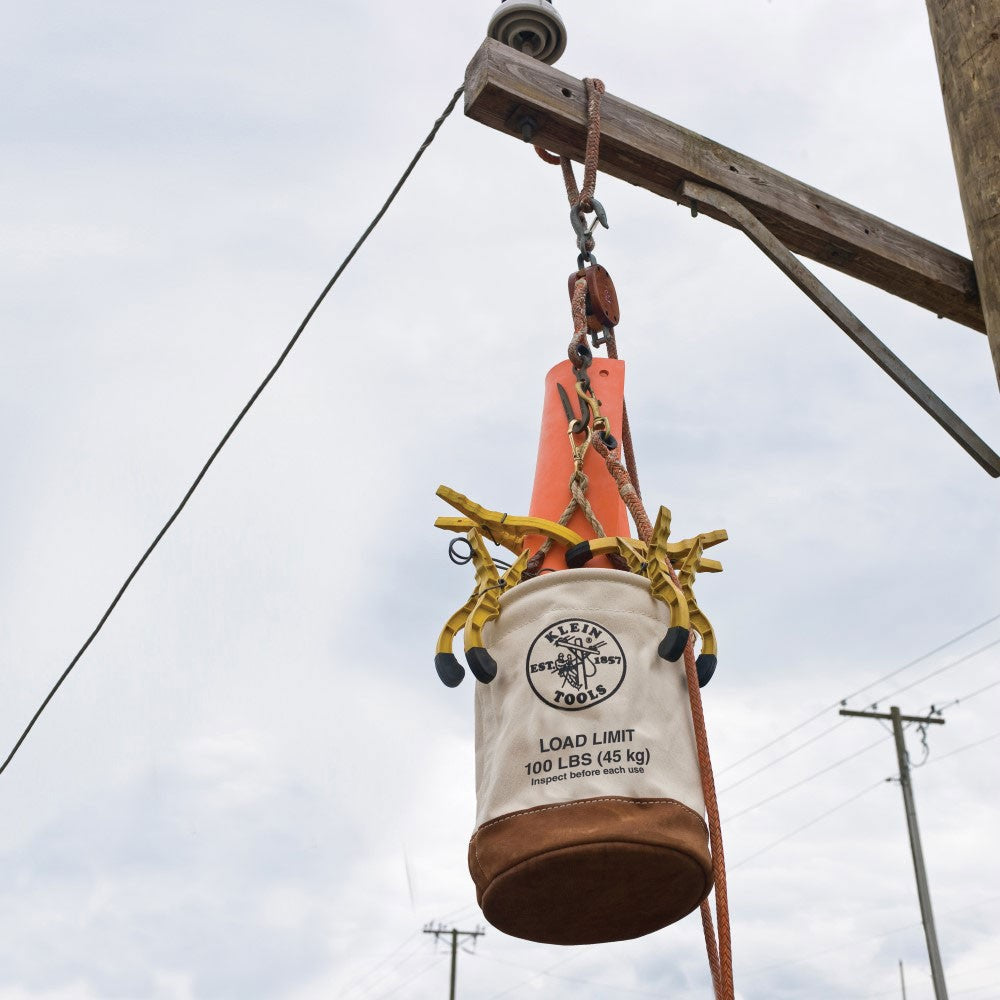 The Klein leather-bottom bucket is made of heavy-duty canvas to withstand harsh job sites. A strong reinforced web strap extends down the side for extra weight capacity. Load rated for 100-pound (45.4 kg).
