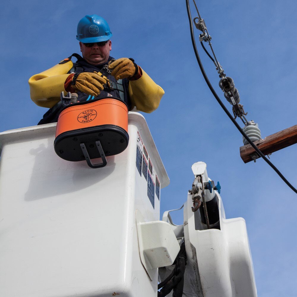 Transfer your tools safely and securely with this all-purpose work bucket. Orange, non-conductive plastic exterior maintains bucket shape. This lineman bucket features 15 pockets to keep your tools organized and secure.
