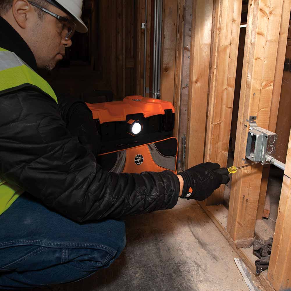 The rugged Tradesman Pro™ Tool Master Rolling Tool Bag from Klein Tools will easily roll over tough terrain with 8-Inch (203.2 mm) wheels, high clearance, and a heavy-duty telescoping handle. Transport up to 250-Pounds (113 kg) of your tools in the wide open interior. Organize smaller items in 19 pockets inside and out, all constructed with durable1680d ballistic weave material. The hard top allows for stacking and has compartments to hold your cell phone, beverages, or small parts. Twist-lock Klein LED Light or Wireless Speaker on front mount (items sold separately).