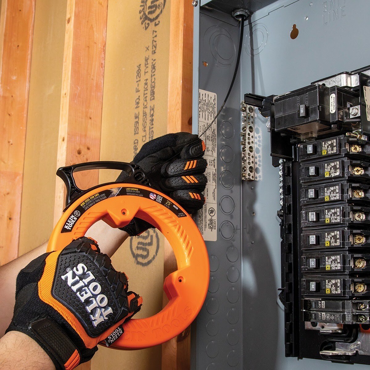 Durable 1/4-inch wide spring steel fish tape with slim-profile plastic tip and laser-etched markings for accurate pulls; compact, impact-resistant case with sloped handle for quick rewinds.