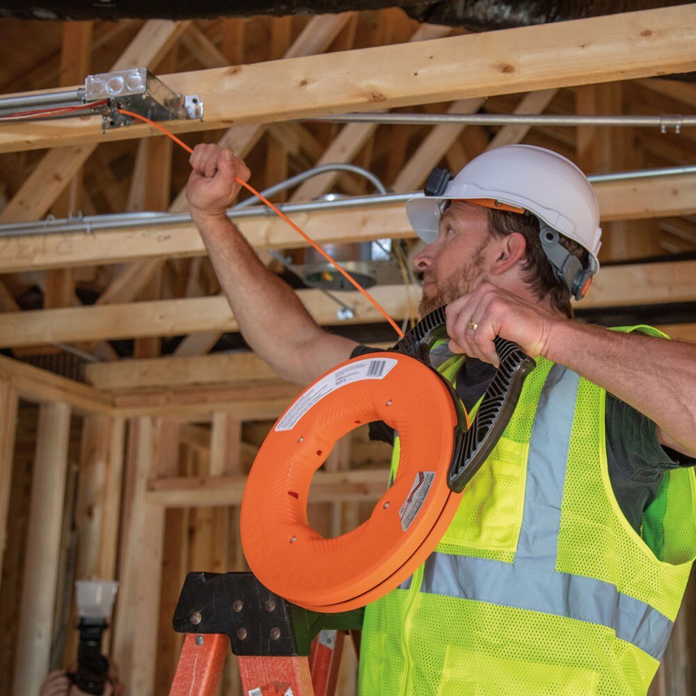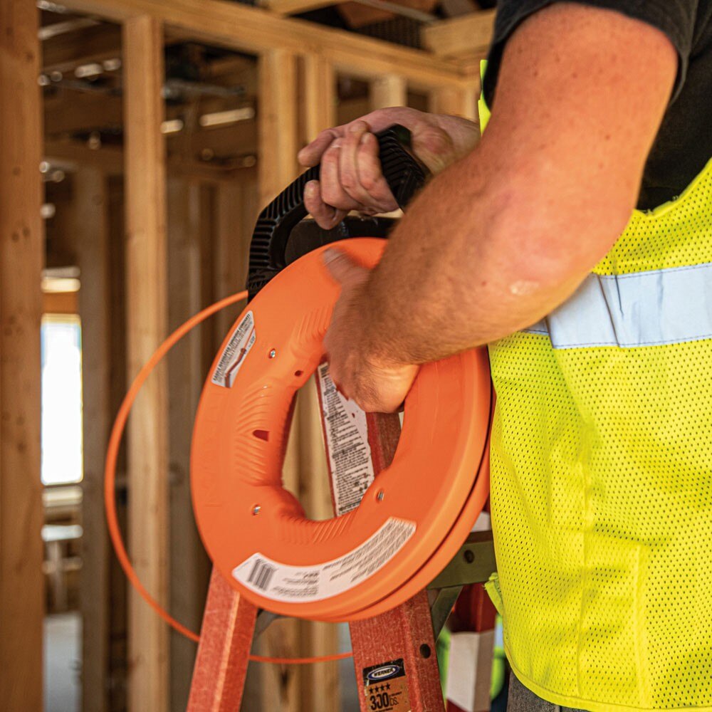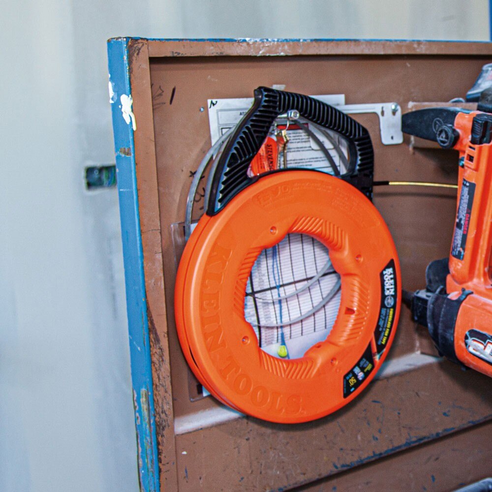 The Klein Tools' 100-Foot Fiberglass Fish Tape with Spiral Steel Leader is perfect for wire runs associated with commercial, residential and voice-data-video installations. The optimized housing and handle design decreases payout effort and reduces binding. A multiple-position handle allows for a firm, steady grip as you pull or rewind the tape. The unique interior case shape combines the leverage of square cases and the comfort of round cases, which makes rewinding tape after a long run easier. The tape features laser-etched descending markings placed at every foot. These markings allow you to accurately measure the depth of conduit runs and determine the amount of tape left to pay out.
