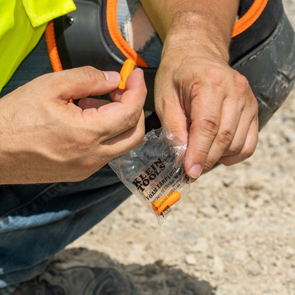Klein Tools Foam Earplugs, 50-Pair, help reduce exposure to hazardous noise and other loud environments. The soft disposable foam design conforms to the ear canal for optimal comfort and a snug fit. Tested in accordance with ANSI S3.19-1974 standards. Noise Reduction Rating (NRR) 33 decibels. Dispensing Box includes a 50-Pack of wrapped pairs of earplugs. Also available in convenient 10-Pair resealable pouch.