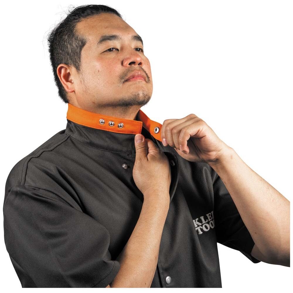 Klein Tools' short sleeve welding jacket with removable welding sleeves is ASTM F1506 Sec. 7.6 compliant. The back of the jacket features a breathable FR mesh for added air flow. Welding sleeves offer flexibility to replace sleeves or use alternate sleeve type. Adjustable metal snap-button collar offers the end user a proper fit and protection from sparks and weld spatter. The jacket includes interior pockets.