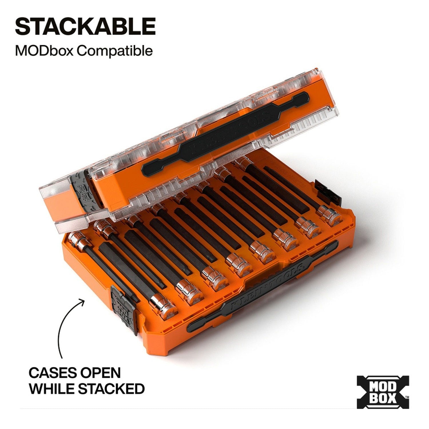The Klein Tools 16-Piece Long Hex Bit Socket Set includes SAE and metric sizes from 5/32-Inch to 1/2-Inch and 4 mm to 12 mm. Long hex bits provide extra clearance in tight spaces, knurled bases improve grip for hand-starting fasteners, and bold stamped size markings aid quick identification. The MODbox compatible case is stackable for organized storage.