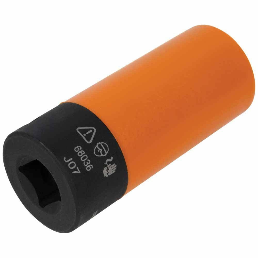 Klein's 6-Piece Coated Socket Set consisting of the commonly used impact socket sizes for utility and construction work. Sockets are 20-Percent lighter than the traditional impact socket set (Cat. No. 66010). The high-torque, 12-Point design is easier to position on fasteners including square ones. The high visibility color coded plastic helps identify the right size socket for the job.