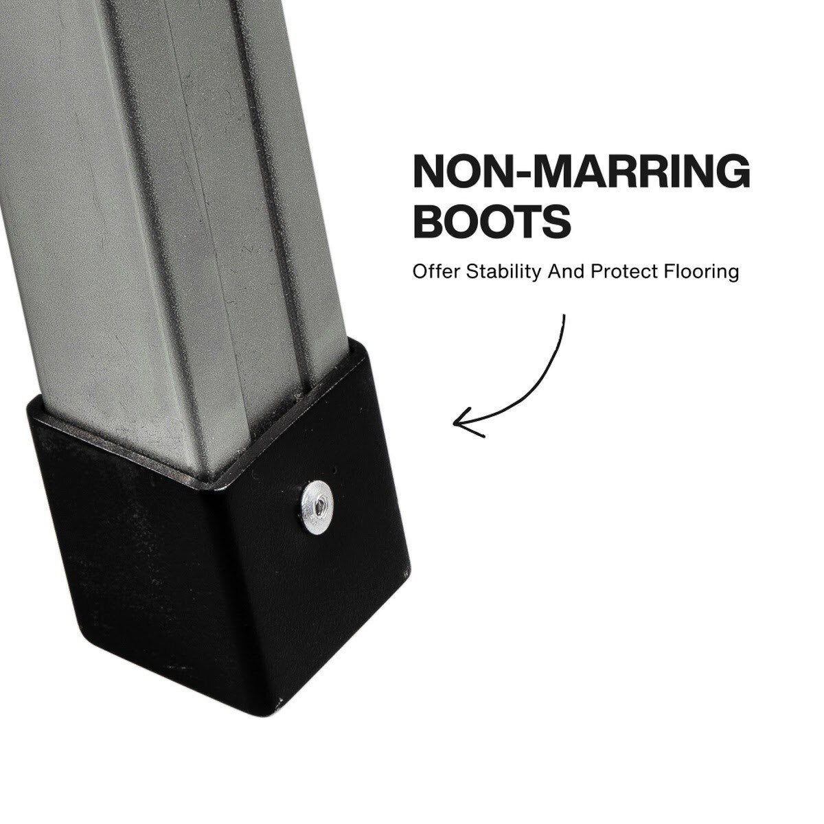 Heavy-duty fixed-leg sawhorses support 1300 lb each or 2600 lb per pair with a non-slip top, collapsible legs, carrying handle and non-marring boots for stable, portable material support.