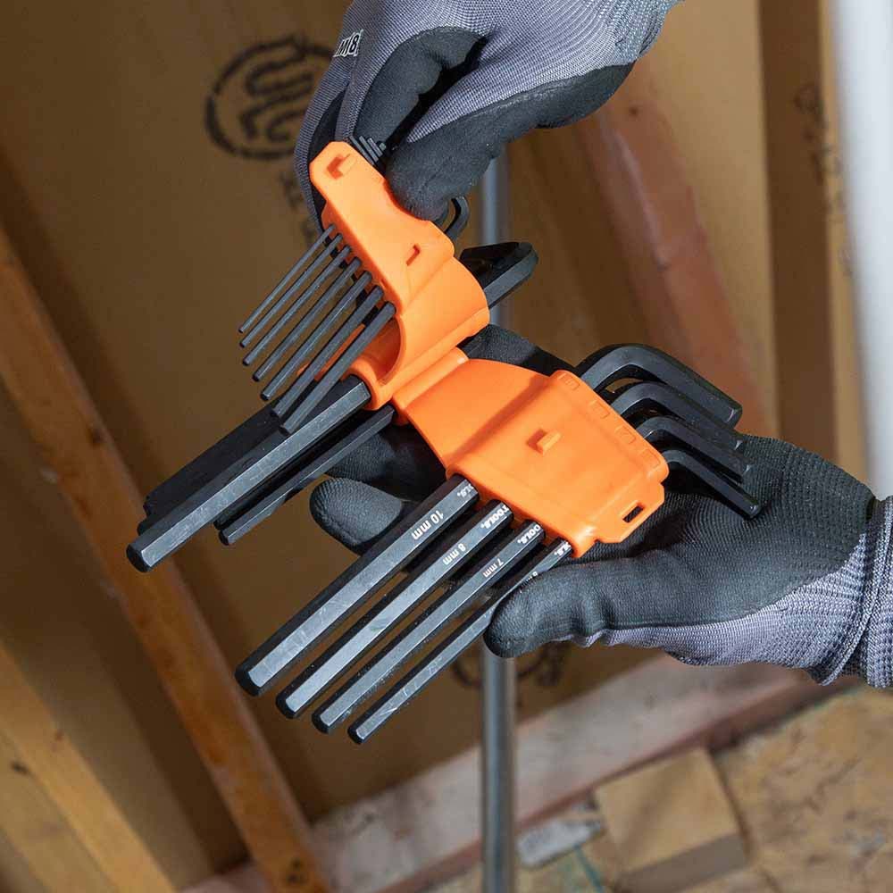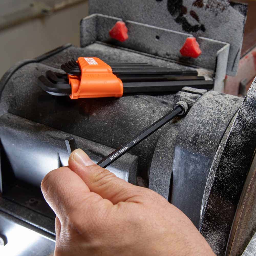 Klein Tools' 10-Key Hex Key Set conveniently consolidates the most popular metric sizes into one compact case. The industrial strength, extended reach chamfered-end hex keys are designed for high engagement with fasteners. The secure storage case features an internal locking mechanism to prevent loss of keys.