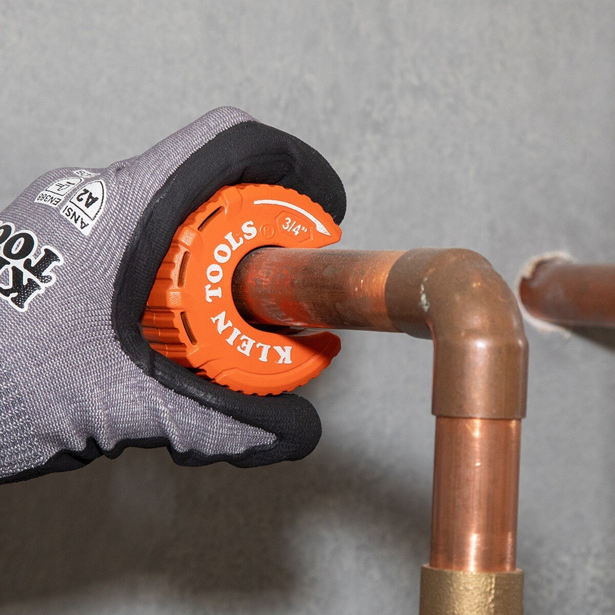 The Klein Tools C-Style Copper Tubing Cutter is designed to operate in ultra-compact spaces, cutting 3/4-Inch (19 mm) copper tubing. Grooves on the exterior allow for improved grip and secure handling, with water drainage ports to help keep water from being stored inside. Free-spinning rollers and a spring-action blade help with smooth, precise cuts while maintaining force throughout the cut.