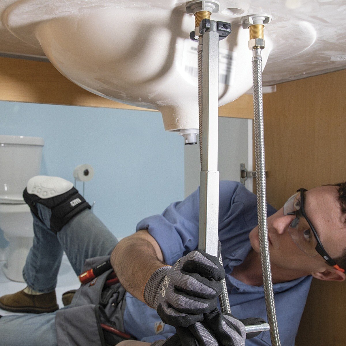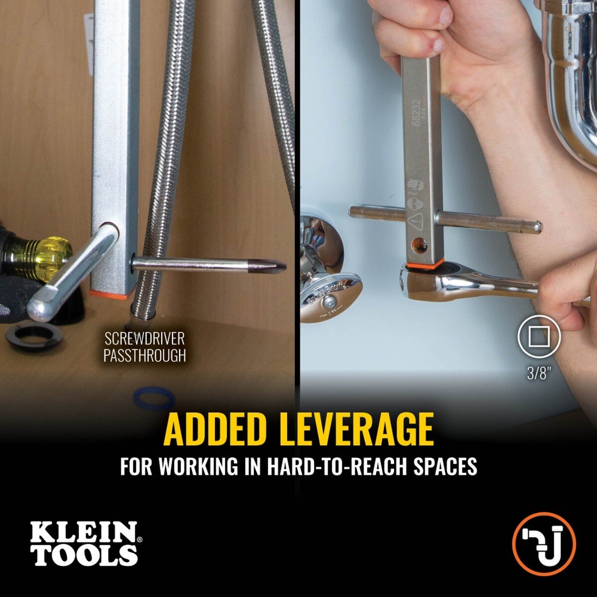 The Klein Tools Telescoping Basin Wrench is designed for hard-to-reach places, extending from 10 to 17 inches. Its spring-action jaw securely grips hex nuts up to 1-1/4 inch. For added leverage, the base of the handle accommodates 3/8 inch socket wrenches and most standard-sized screwdrivers.