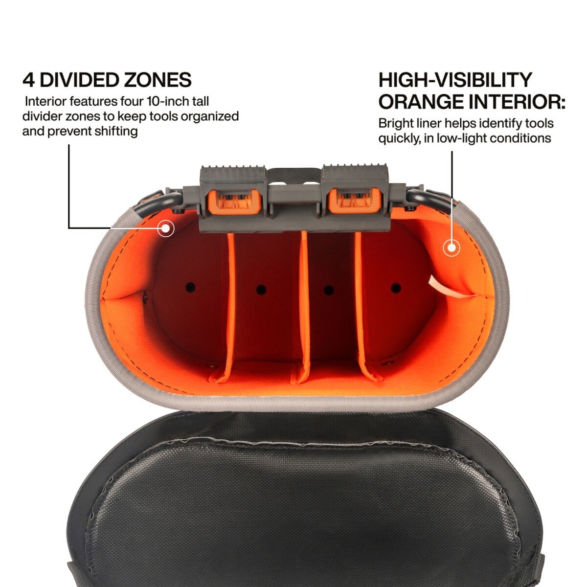 Klein Tools 20-Inch Deep Oval Bucket keeps heavy tools organized and supported. Four tall dividers prevent gear pile-up, while a rugged vinyl cover and high-visibility liner keep gear secure and easy to spot. Built tough and Bucket Work Center rail compatible, it's made to handle heavy-duty utility work.