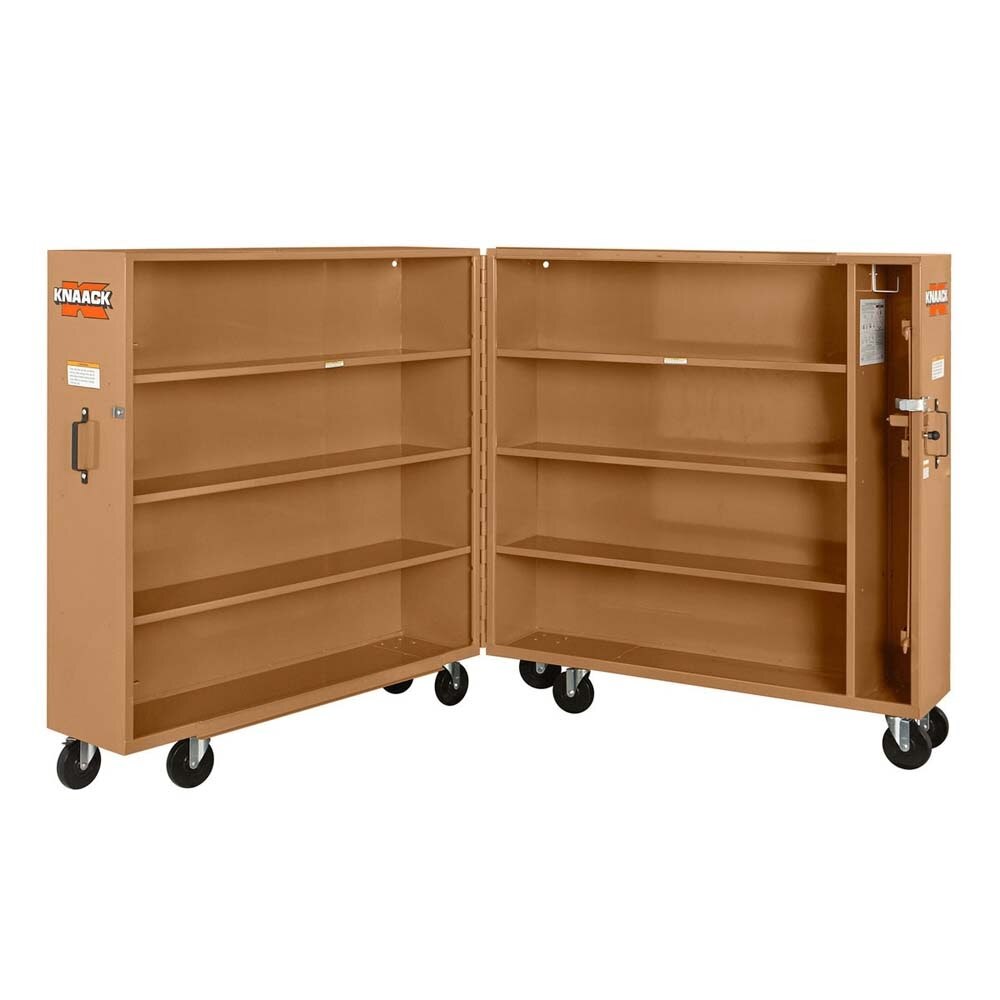 The Model 100 Folding Rolling Cabinet is a high-quality, locking tool cabinet that measures 65 inches high and approximately 60 inches to 125 inches wide. When fully opened, the industrial cabinet has a capacity of 60.9 cubic feet for maximum storage space. It even boasts shelving for easy-access and convenient organization for tools, equipment, and other supplies.