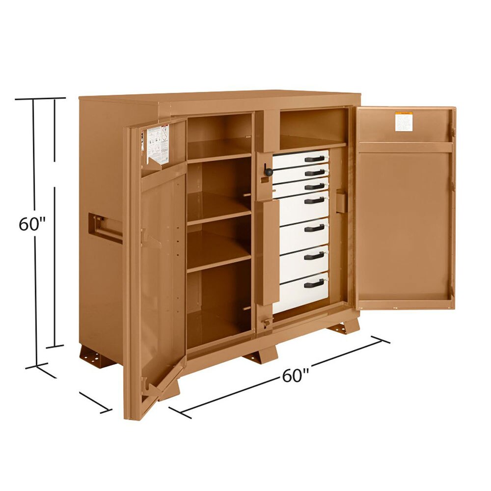 The Model 112 JOBMASTER™ Cabinet measures 60in long, 30in wide and has a capacity of 54.9 cu ft. This upright cabinet features half-width shelves and drawers for more organization.
