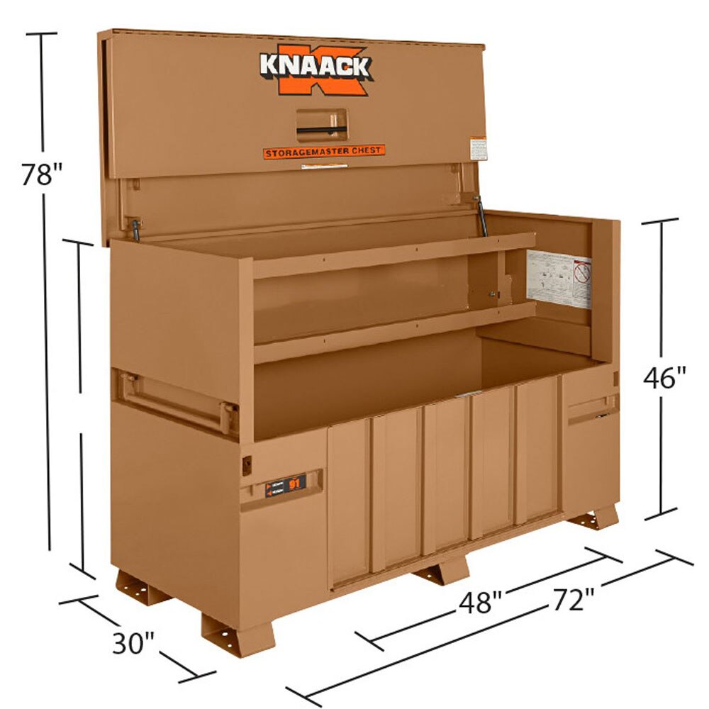 - The Model 91 STORAGEMASTER Piano Box measures 72in wide, 78in tall and has a capacity of 57.5 cu ft. It features a built-in 12-gauge steel ramp to make loading large, bulky items easy. Ideal for every trade, it is caster-ready and includes full-width shelves for organization of jack hammers, tools and supplies. It also features a bi-fold cover which folds completely out of the way for unrestricted access.
