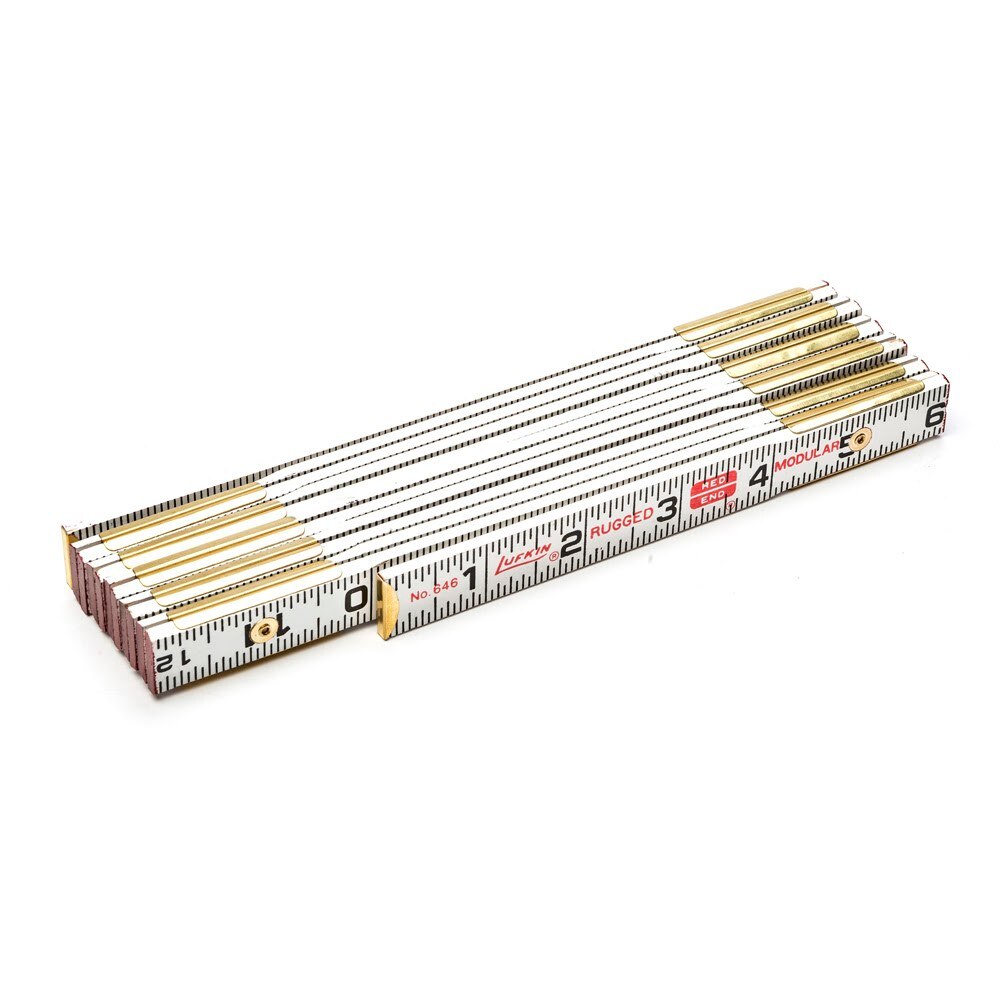 The LUFKIN 646LN is a 6 Ft. Red End modular spacing folding wood rule. All sections have a square end and every joint opens on an even number. The inside is marked with six scales in a 16 In. module. The outside is graduated on both edges to the 1/16th. The rule permits butting the rule on the first 16 In. module.
