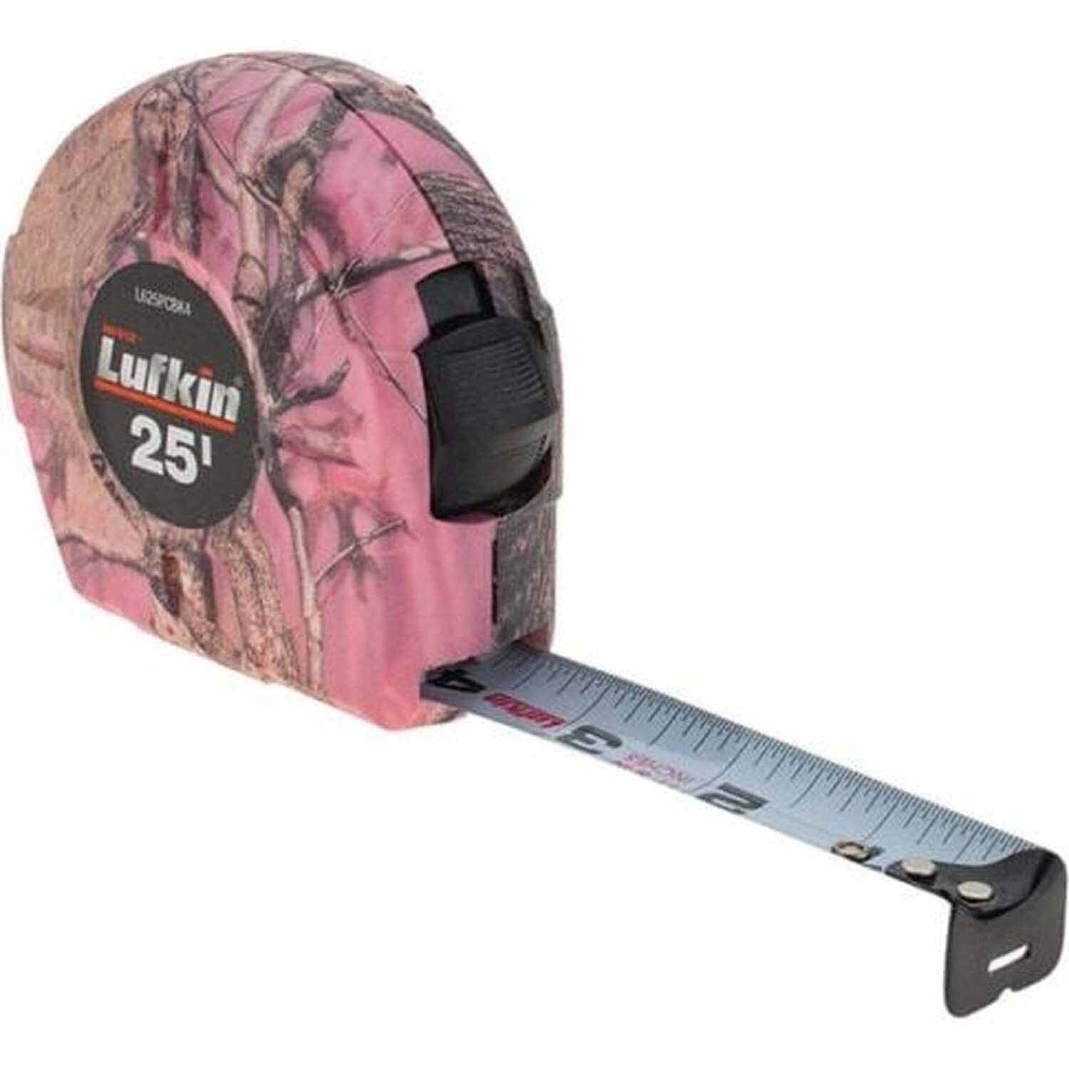 Durable 25 ft tape measure featuring a pink camouflage ABS plastic case and a white steel blade with clear 1/16 in inch graduations.