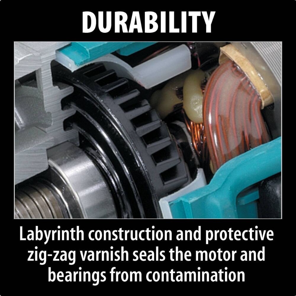 - Labyrinth construction seals and protects the motor and bearings from dust and debris for longer tool life