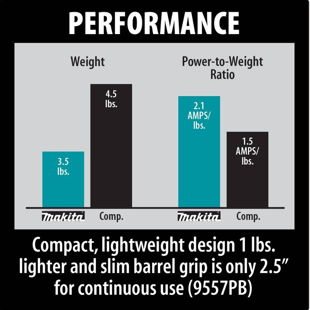 Makita’s 4-1/2” Cut-Off/Angle Grinder combines 7.5 AMP power with comfort and motor-protection features for longer-lasting industrial performance. The 9557PB Angle Grinder delivers 11,000 RPM. The Cut-Off/Angle Grinder also features a range of durability features including labyrinth construction which seals and protects the motor and bearings from dust and debris for longer tool life, as well as a protective zig-zig varnish engineered to seal the armature from dust and debris. Ease-of-use features include an extra large paddle switch for comfortable operation, and a lock-on/off feature for continuous operation. The 9557PB weighs only 4.5 lbs., with a side handle that can be easily installed on either side of the tool. This grinder also has an AC/DC switch for use with alternative-power sources. The 9557PB is a versatile and powerful grinder engineered for cutting, grinding and polishing applications. The 9557PBX1 is a kit that includes the Angle Grinder, 5 4-1/2” grinding wheels, metal tool case, cut-off and grinding wheel guards, as well as a Makita Diamond Blade with turbo rim engineering for constant contact with material for a smoother cut and finish.