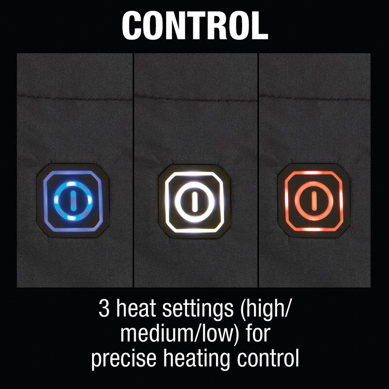 Stay warm with the 18V LXT® Lithium-Ion Cordless Heated Blanket (DCB200A). One 18V LXT® 6.0Ah Battery (sold separately) provides up to 35 hours of heat on the low setting. The blanket has three heat settings (high/medium/low) for precise heating control. The battery is stored in a zipper pocket with power connection. Snap buttons and a strap allow the blanket to wrap around the user’s waist or shoulders. The blanket is washer and dryer safe.