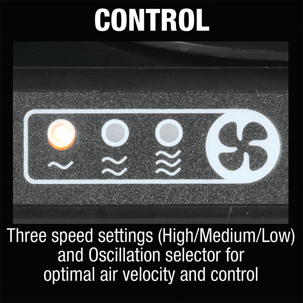 - Three speed settings (High/Medium/Low) and Oscillation selector for optimal air velocity and control