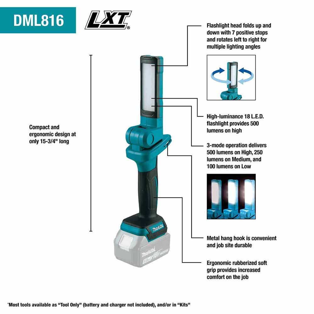 - Up to 75 hours of illumination with 6.0Ah 18V LXT® Battery (battery sold separately)