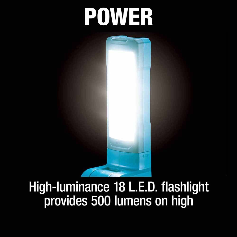 The Makita 18V LXT® Cordless 18 L.E.D. Flashlight is both compact and portable to provide light to any project whether that be on the job site or in a garage. This high-luminance 18 L.E.D. flashlight offers three modes in low, medium, and high to provide as little or as much light with multiple angles available to get the light where needed. Using one 6.0Ah 18V LXT® battery (sold separately), it offers up to 75 hours of continuous runtime, a metal hook to transform it into an overhead light, and a rubberized handle for increased comfort. With multiple uses and its rugged construction, this flashlight will become an ideal addition to any workspace.