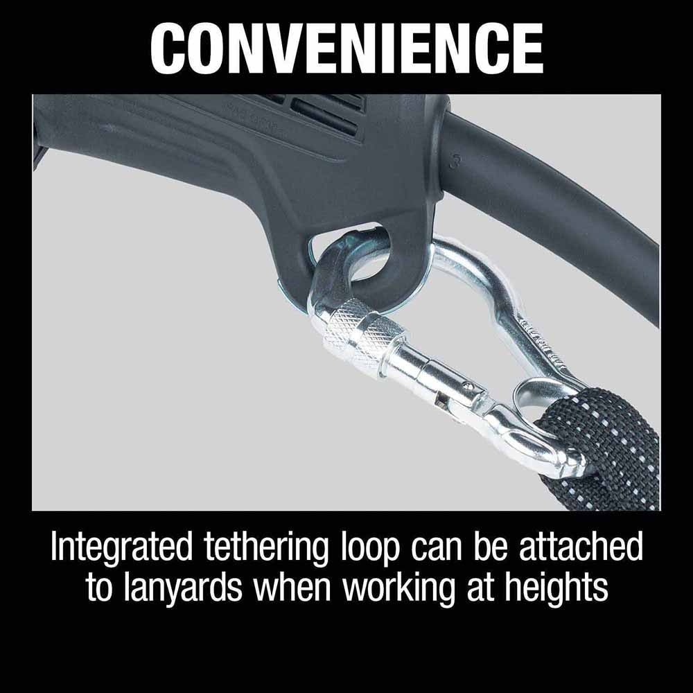 • Integrated tethering loop can be attached to lanyards when working at heights or on a lift