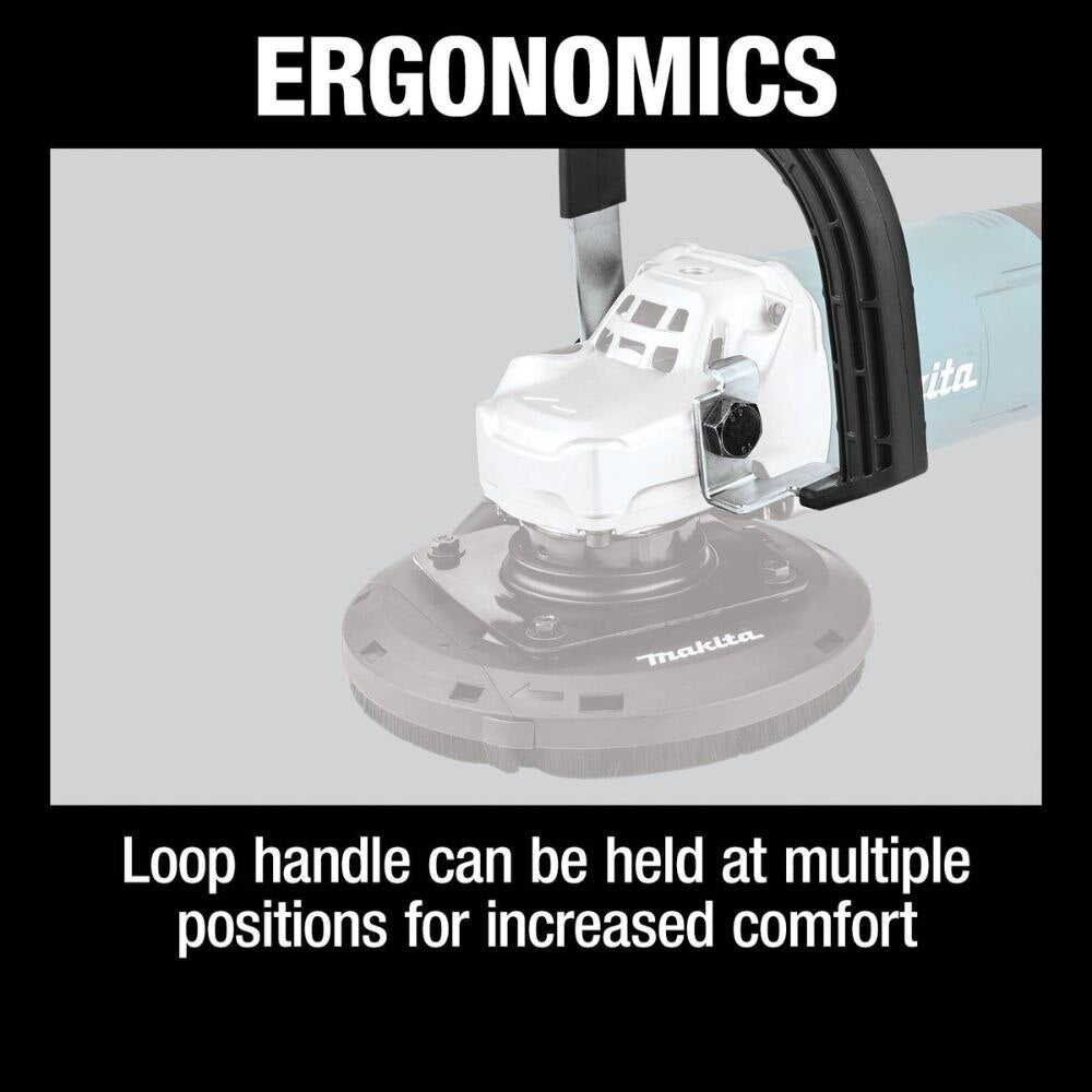 The Makita® 7” Concrete Surface Planer with Dust Extraction Shroud (GA9060RX3) combines power and ease-of-use with superior handling in a compact size. It is engineered for concrete finishing, concrete material removal and surface coating removal. The GA9060RX3 is powered by a 15 AMP motor, which delivers 6,600 RPM for optimum performance. A soft start provides smooth start-ups for longer gear life. Anti-restart protection is designed to prevent motor start-up in the on-power switch position should power be disrupted. The integrated dust extraction shroud is designed to capture dust during operation and includes a removable dust shroud cap that allows the tool to plane in corners and against walls. The shroud has soft brushes to help prevent dust from escaping, and the 4-spring suspension system keeps the shroud flush with the surface during movement. The concrete planer has an ergonomic soft grip and rear-handle trigger switch with lock-off function, as well as an ergonomic loop handle for improved comfort. It is compact, measuring 17-3/4” long and weighing 12.4 lbs. Use it with 7” Diamond Cup Wheels for lower vibration and fast material removal.