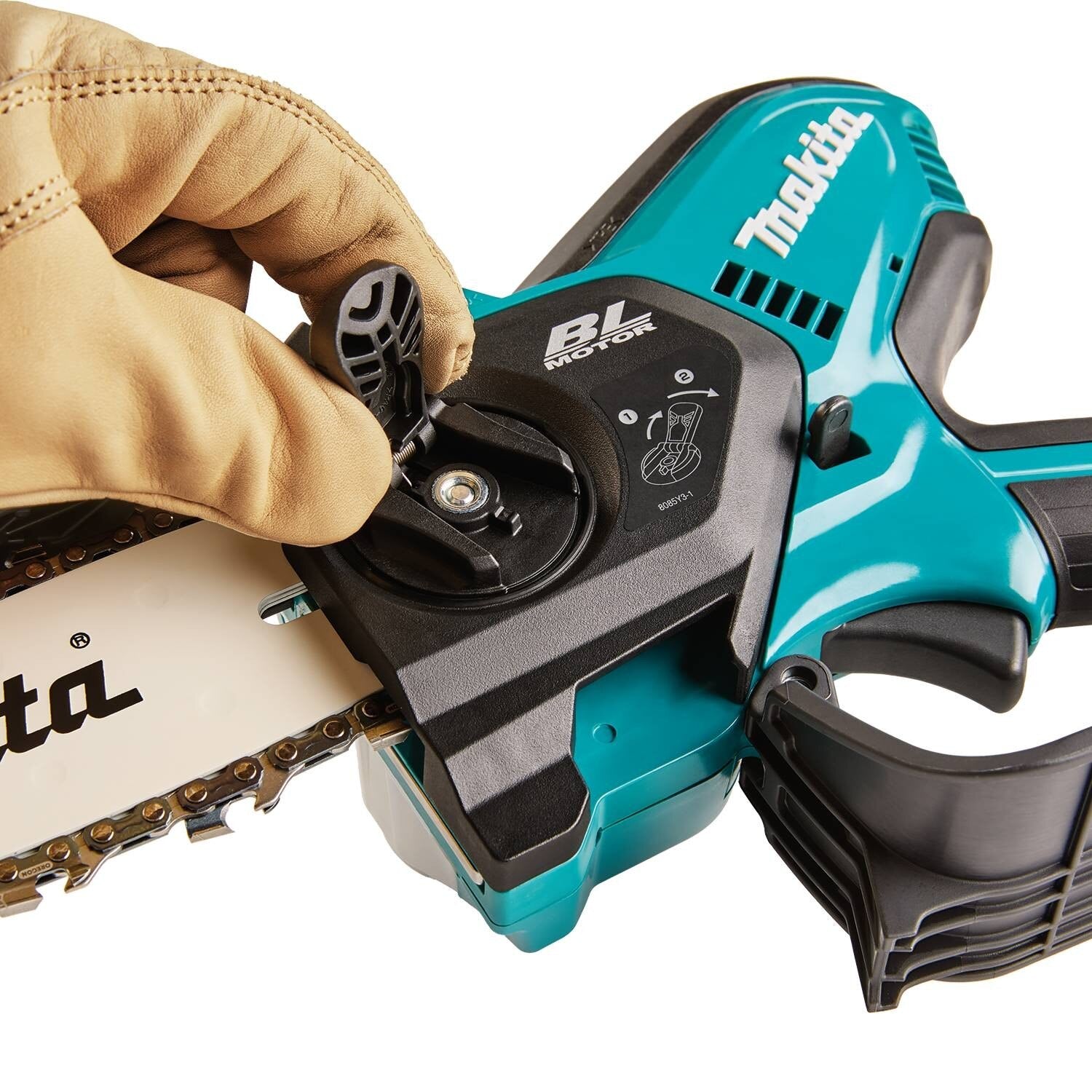 - Retractable guard provides saw chain barrier