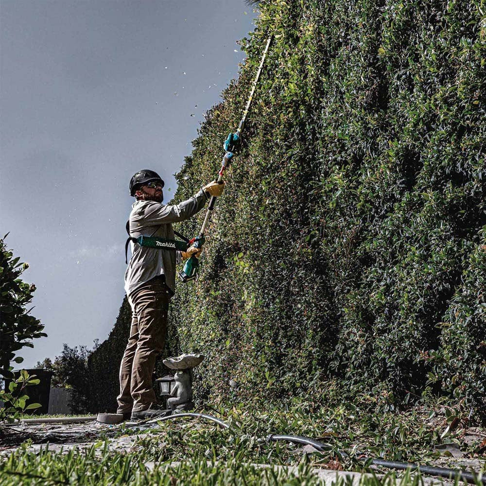 The Makita 40V max XGT 24" Articulating Pole Hedge Trimmer (GNU01) offers powerful, cordless performance with 24" double-sided blades and a 115° working range for trimming overhead and low hedges. It's up to 20% lighter than gas models, with no pull starts, mixing, or emissions. The brushless motor delivers up to 4,000 SPM for fast cutting, and the trimmer runs up to 65 minutes on High with a 40V XGT® 4.0Ah battery. It features six angle settings, three speed options, and a commercial-duty gear case for durability, plus a soft grip handle for better control.
