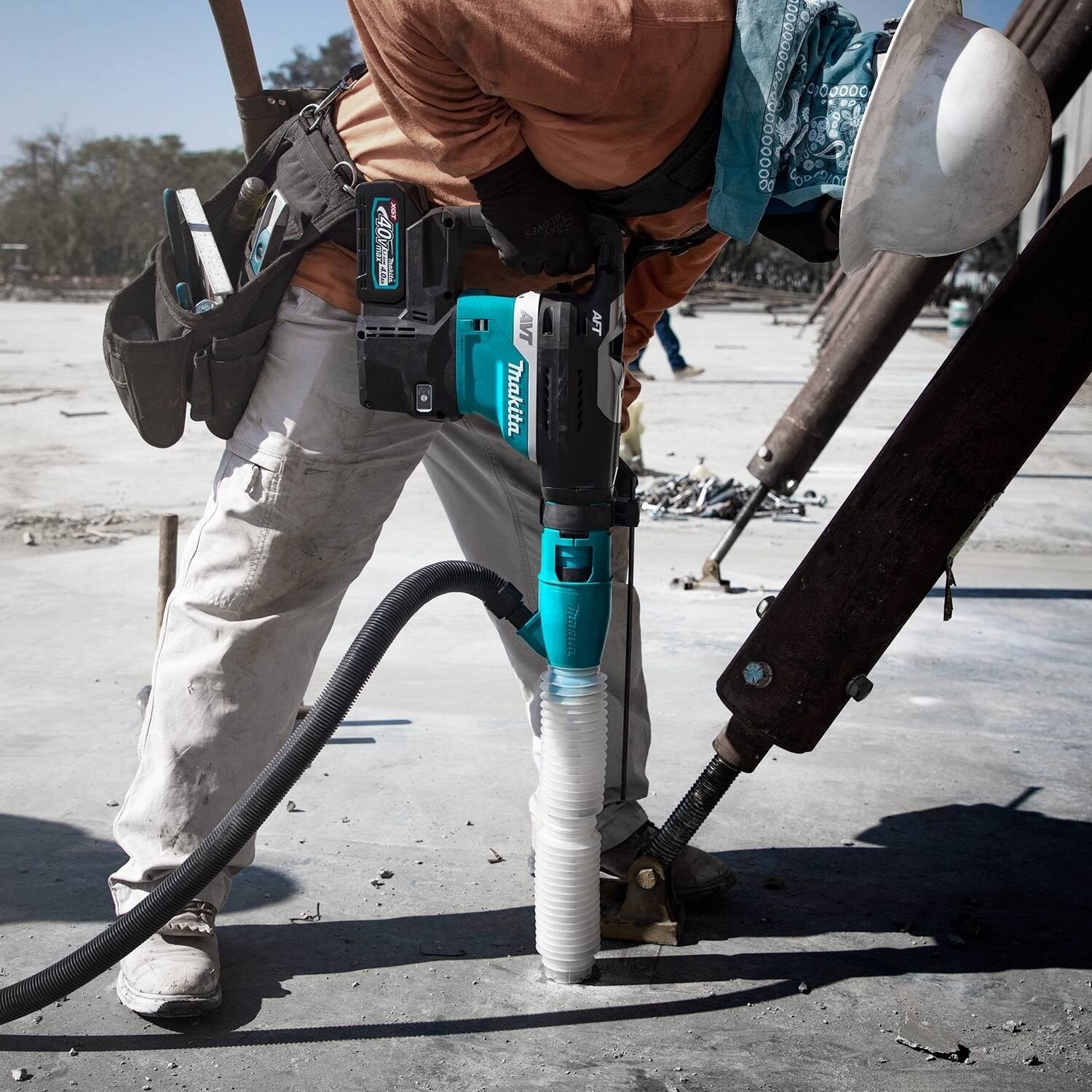 The 40V max XGT® Brushless 1-9/16” AVT® Rotary Hammer Kit (GRH05M1) is a cordless concrete solution designed for heavy-load applications. It delivers the power, speed, and run-time for corded demands, without the cord. The GRH05M1 features Active Feedback-Sensing Technology (AFT®), which electronically turns off the motor if rotation of bit is suddenly forced to stop, and Anti-Vibration Technology (AVT®) for reduced vibration. More than just a padded handle, AVT is an internal counterbalance that uses air pressure to move counterweight pistons in the opposite direction of the drive piston to actively reduce vibration. In addition, the vibration-absorbing back handle and side handle further reduce vibration. For added durability in harsh job site conditions, Extreme Protection Technology (XPT™) is engineered for improved dust and water resistance. Auto-Start Wireless System (AWS®) uses Bluetooth® technology for wireless power-on and power-off communication between the equipped tool and dust extractor. Once connected via AWS, the AWS-equipped dust extractor will automatically power on or off when the AWS-equipped cordless tool starts or stops, running only when the tool is in use. This increases productivity on a single charge and reduces continuous noise at the job or work site. Constant speed control automatically applies additional power under load for optimum performance. The torque limiting clutch is engineered to prevent gear damage by automatically disengaging the gears if the bit binds, and constant speed control automatically adds power to the motor to maintain speed under load to complete the most demanding jobs. Additional performance features include an electric brake, variable speed dial, built-in L.E.D. light, a soft-start to suppress start-up reaction, and Soft No-load function that automatically reduces the speed of the motor when idling. The Rotary Hammer has dust extraction capability an optional Makita Dust Attachment Kit (sold separately). It has 2-modes of operation - "Hammering with Rotation" or "Hammering Only". The GRH05M1 is ideal for a range of trades including mechanical/electrical/plumbing contractors, concrete contractors, road and bridge contractors, utility workers, pest control, maintenance operations, and more. It accepts SDS-PLUS bits. XGT is a system of equipment, tools, batteries and chargers utilizing 40v max lithium-ion batteries. XGT is engineered to deliver high power to take on high-demand applications, allowing users to completely transition to a cordless job site. XGT is equipped with advanced brushless motor engineering, intelligent digital communication, and superior durability features to outpower, outsmart and outlast the competition.