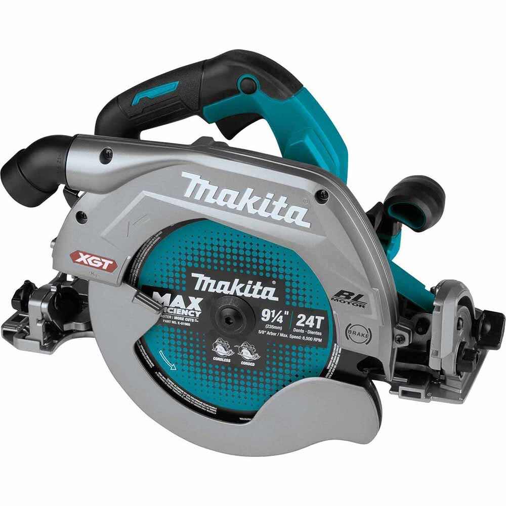 The 40V max XGT® Brushless 9-1/4" Circular Saw with Guide Rail Compatible Base combines efficient cutting with the convenience of guide rail compatibility. The Makita-built brushless motor delivers 4,000 RPM for fast cutting performance, with constant speed control that automatically applies additional power under load for optimum performance. It offers 3-3/8” of cutting capacity at 90° with bevel cut capacity up to 1° left and 60° right with positive stops at 22.5° and 45°. It features a die-cast magnesium base, blade guard, and blade cover for lower weight at only 10.4 lbs. with battery (battery sold separately). The convenient guide rail compatible saw base interacts with optional guide rails to provide perfect, dead-on straight or bevel cutting without the need for an adapter. Combined with a guide rail (sold separately), the GSH03 is a more portable option over a table saw for a range of cutting applications. The saw also features Auto-Start Wireless System (AWS®). AWS® uses Bluetooth® technology for wireless power-on/power-off communication between the tool and an AWS® equipped dust extractor. The saw has an electronic brake for maximum productivity and soft start to suppress start-up reaction for smoother start-ups and longer gear life. Convenience features include an L.E.D. light with pre-glow and afterglow to illuminate the work area, an onboard hex wrench for blade changes, and a secondary handle for two-handed operation. XGT® is a system of equipment, tools, batteries, and chargers utilizing 40v max lithium-ion batteries. XGT® is engineered to deliver high power to take on high-demand applications, allowing users to completely transition to a cordless job site. XGT is equipped with advanced brushless motor engineering, intelligent digital communication, and superior durability features to outpower, outsmart and outlast the rest.
