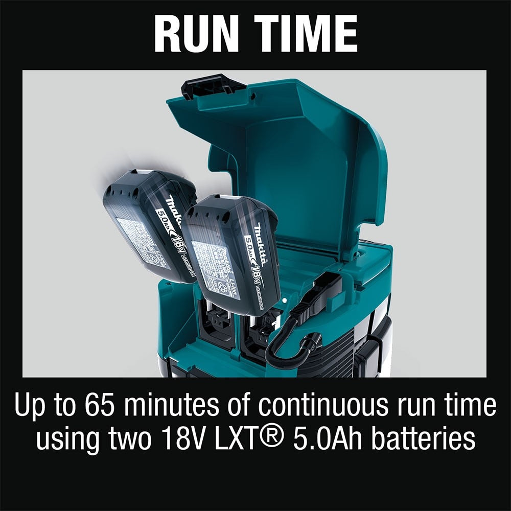 - Up to 65 minutes of continuous run time on low setting and 30 minutes on high setting using two 18V LXT® Lithium-Ion 5.0Ah batteries BL1850B