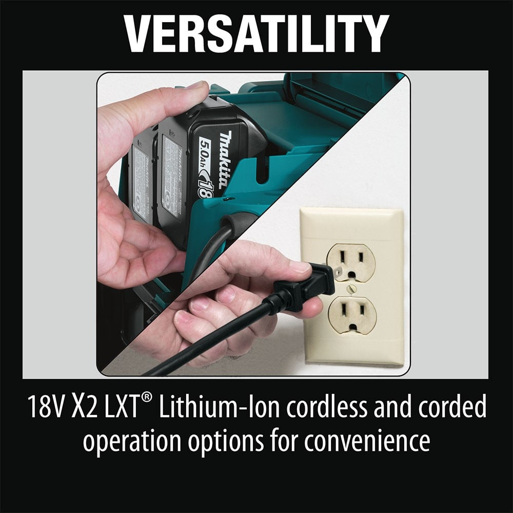 - Powerful Makita-built motor delivers 74 CFM and 36" water lift of suction using two 18V LXT® Lithium-Ion batteries