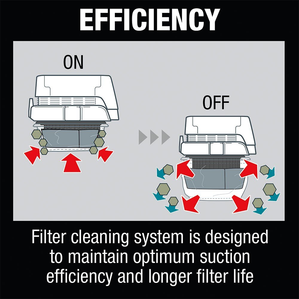 - Filter cleaning system is designed to maintain optimum suction efficiency and longer filter life