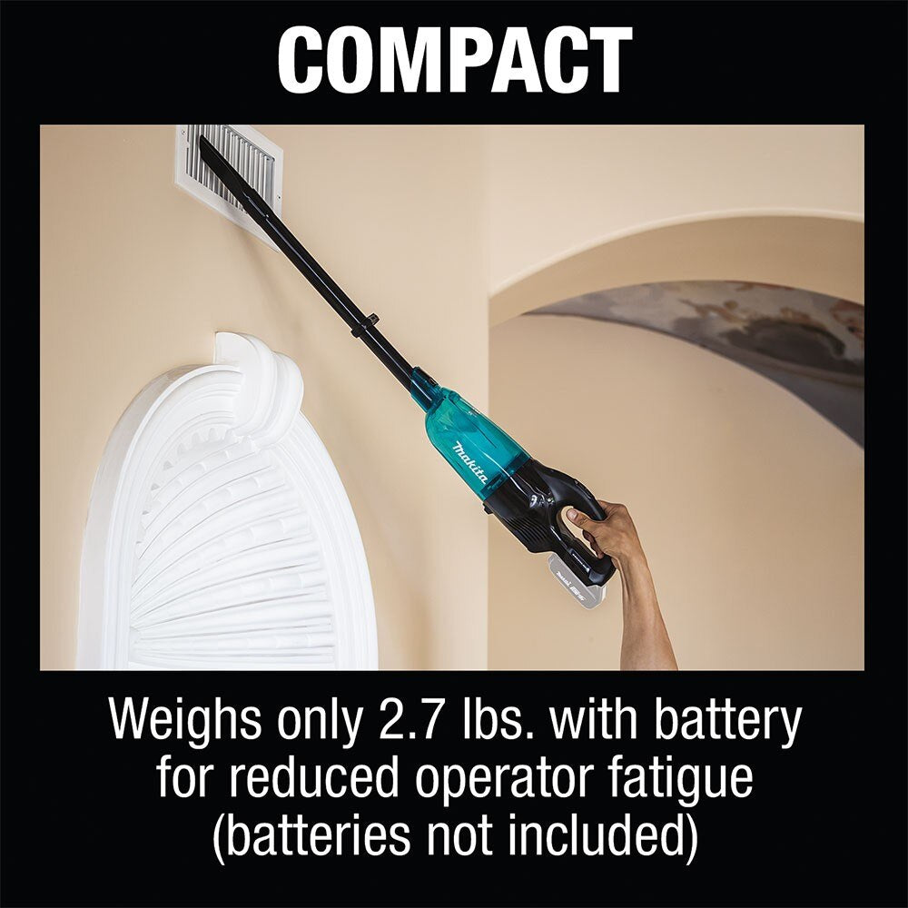 The Makita® 18V LXT® Brushless Cordless Vacuum (XLC03ZBX4, tool only) is a compact and powerful cordless vacuum with strong suction for fast and efficient cleaning. The vacuum can be used with trigger mode or slide switch mode for ease and convenience. Compact and ergonomic design for operator comfort and, at 2.7 lbs., is lightweight for reduced operator fatigue. A bagless cloth filtration system allows for easier cleaning and quicker debris disposal. The powerful Makita-built motor delivers up to 49 CFM. The vacuum and included nozzle and attachment feature the distinctive teal and black trade dress. It’s part of Makita’s expanding 18V LXT® system, the world’s largest cordless tool system powered by 18V lithium-ion batteries. Makita® 18V Lithium-Ion Batteries have the fastest charge times in their categories, so they spend more time working and less time sitting on the charger. For improved tool performance and extended battery life, Makita created Star Protection Computer Controls™. Star Protection is communication technology that allows the Star Protection-equipped tool and battery to exchange data in real time and monitor conditions during use to protect against overloading, over-discharging and overheating. For increased versatility, the tool can also be powered by Makita® 18V LXT® and Compact Lithium-Ion Batteries with the star symbol on the battery indicating Star Protection inside.