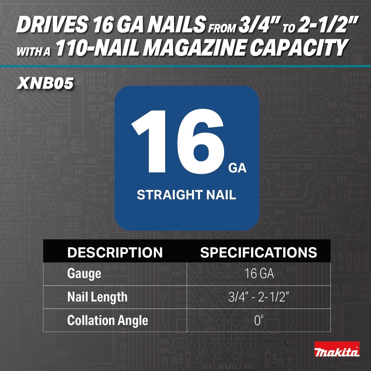 Makita XNB05Z 18V LXT Brushless Cordless 2-1/2" 16 Gauge Straight Finish Nailer, Tool Only
