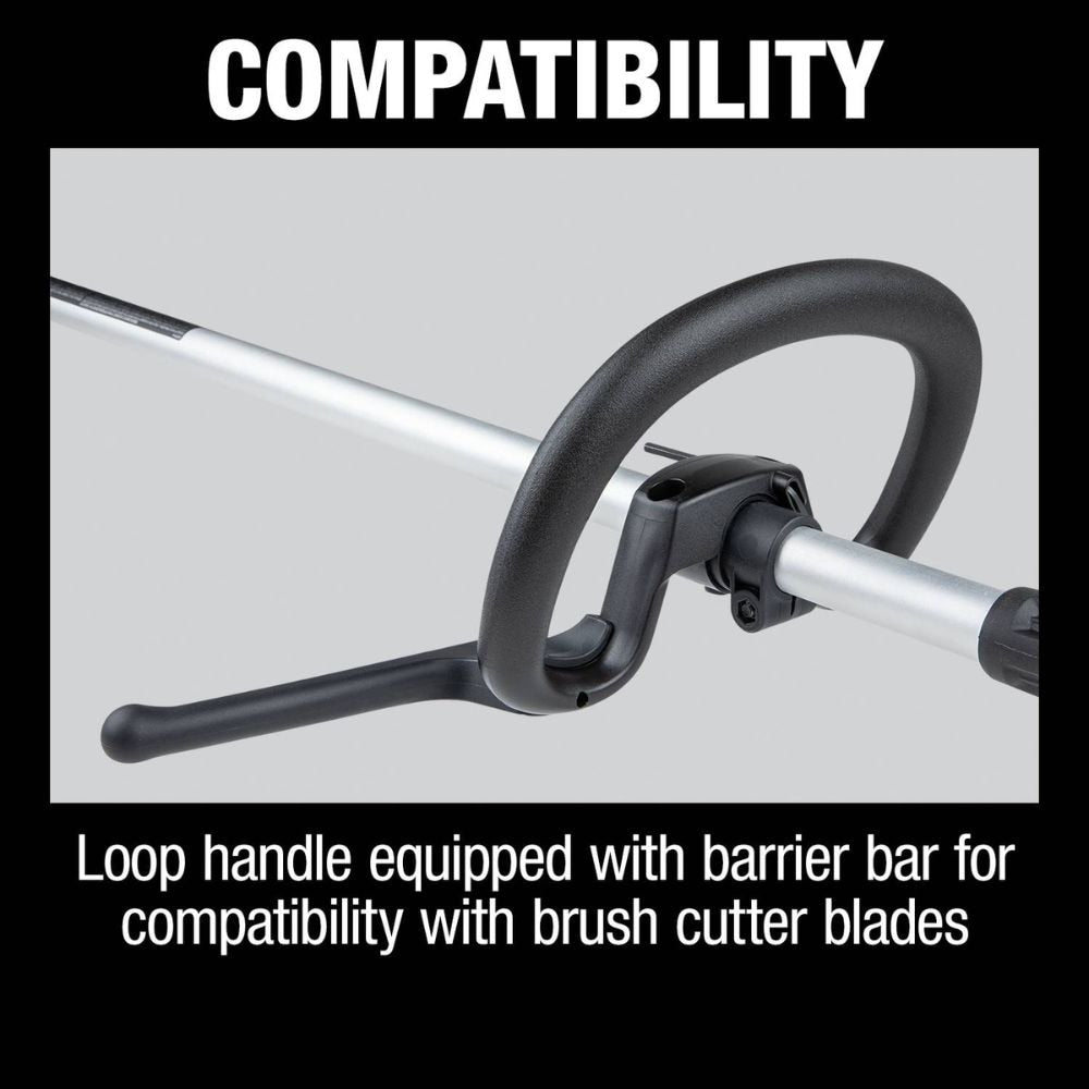 - Loop handle equipped with barrier bar for compatibility with brush cutter blades