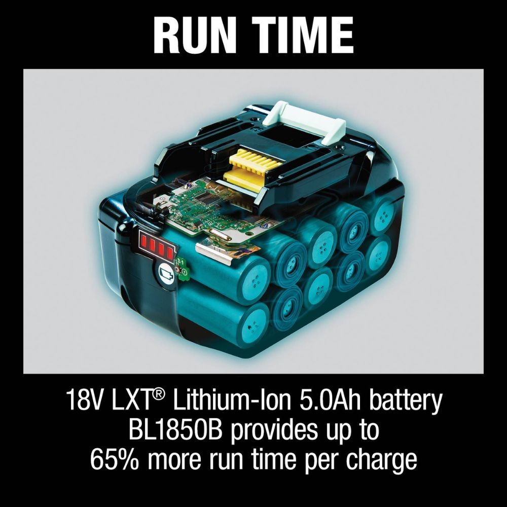 - 18V LXT® Lithium-Ion 5.0Ah battery BL1850B provides up to 65% more run time per charge compared to BL1830