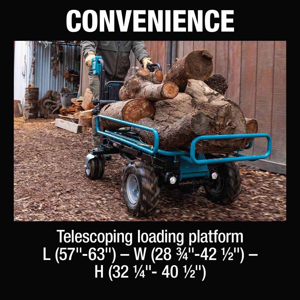 The 36V (18V X2) LXT® Brushless Material Handling with Dump/Pipe Frame, Tool Only (XUC05Z) is an ideal solution for transporting materials on job sites and other settings. The XUC05Z delivers up to 100 minutes of run time (distance equivalent to 4.5 miles) under load using four 18V LXT® 6.0Ah batteries (batteries not included). The Material Handler features three forward speeds and one reverse with variable speed controlled by a switch trigger in each range. The maximum forward speed is 3 mph and a maximum load capacity of 650 lbs. It features a telescoping loading platform that can adjust (57"-63" length, 28 ¾”-42 ½” width, and 32 ¼”- 40 ½” height) to the user’s needs. The XUC05Z is engineered to operate using two 18V batteries at a time, with the ability to utilize additional onboard batteries for longer run times. The XUC05Z features a warning beep that will go off if the unit is overloaded either on a slope or flat ground. It also beeps when in-use batteries are running low as a reminder to the user to cycle through the other set of batteries. Convenience features include a hand lever-operated mechanical axle disc brake plus an electromagnetic brake that prevents the Material Handler from rolling forward or backward when the throttle is not engaged. There are headlights, a taillight, and a level gauge for more convenience. It also features handles that adjust to three separate heights to accommodate multiple users, and the handles feature rubberized soft grips that provide increased comfort on the job. The Material Handler features Extreme Protection Technology (XPT™) which is engineered to provide increased dust and water resistance in harsh job site conditions. It’s part of Makita’s expanding 18V LXT System, the world’s largest cordless tool system powered by 18V lithium-ion slide-style batteries. Makita® 18V LXT® Lithium-Ion Batteries have the fastest charge times in their categories, so they spend more time working and less time sitting on the charger.
