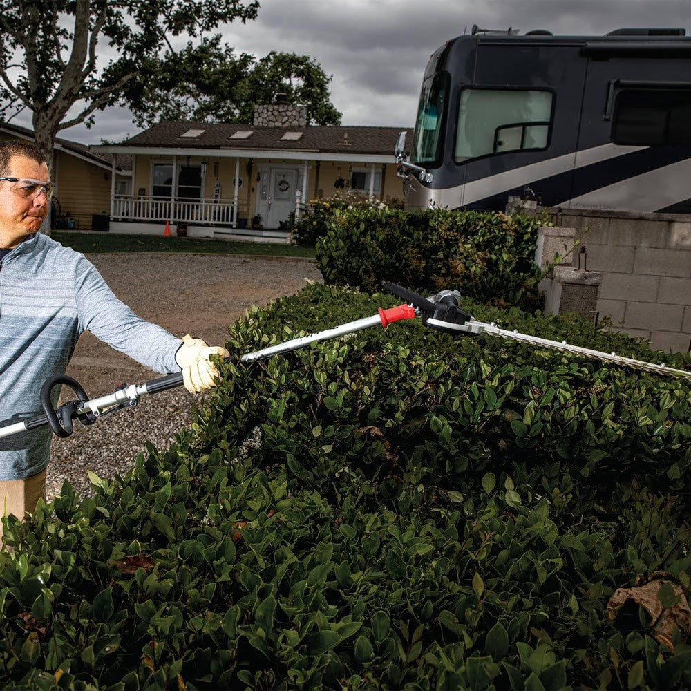 - 20" Articulating Hedge Trimmer Attachment with dual action, double-sided steel blades for faster cutting