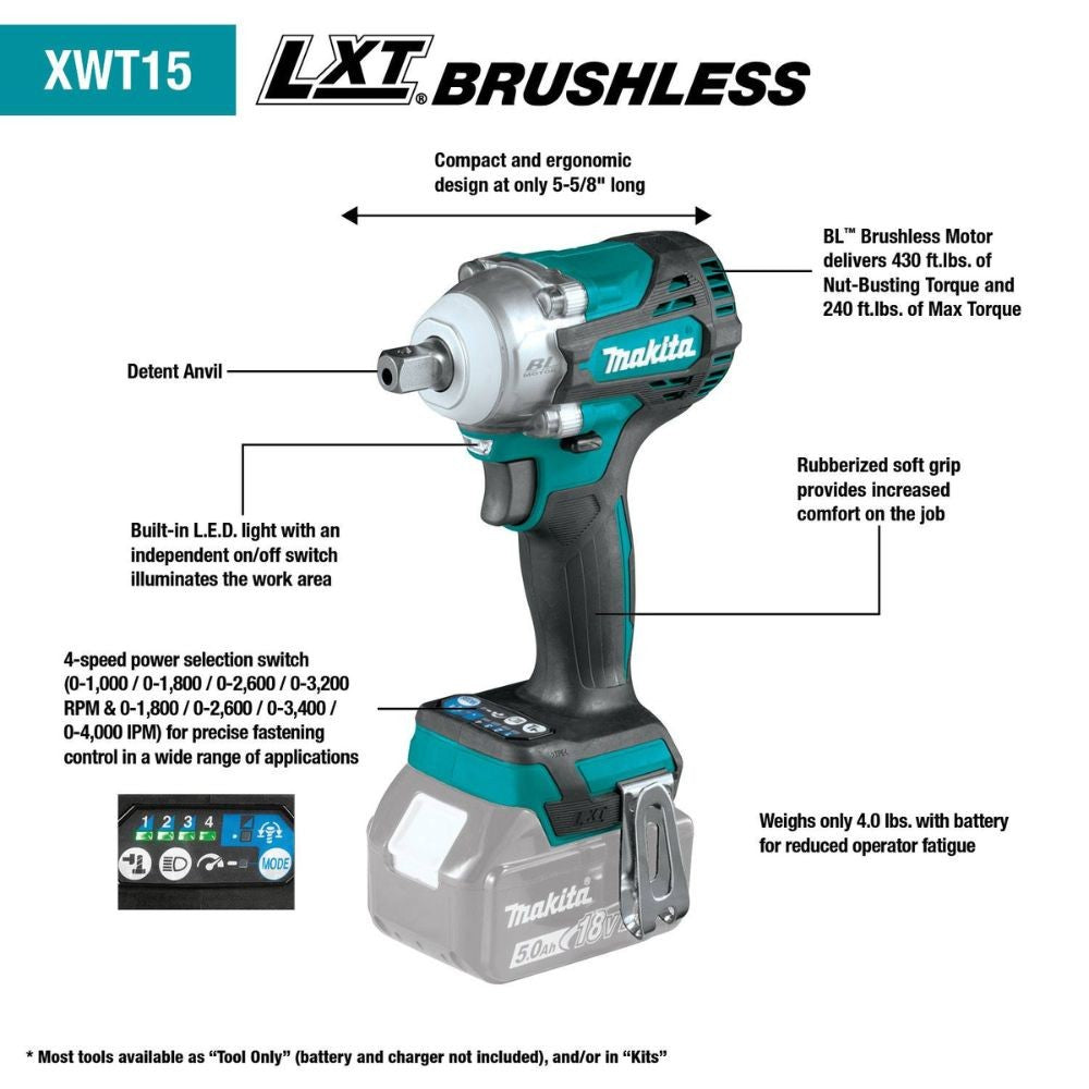 Makita’s 18V LXT® Lithium-Ion Brushless Cordless 4-Speed 1/2" Sq. Drive Impact Wrench Kit w/ Detent Anvil (5.0Ah) (XWT15T) provides improved fastening control, ideal for automotive, installation, and fabrication trades. The impact wrench combines extended run time and speed control for unmatched fastening performance. It is powered by a Makita-built brushless motor for longer run time. The brushless motor delivers 240 ft.lbs. of Max Torque and 430 ft.lbs. of Nut-Busting Torque. Precise fastening control is achieved through the 4-speed power selection switch, which accounts for a wide range of applications. Three forward and three reverse rotation auto-stop modes offer increased efficiency when fastener is adequately loosened. The full-speed mode function reduces the trigger pull to reach full speed. The XWT15T features Makita's Extreme Protection Technology (XPT™), a protective seal inside the tool. It is designed to improve a tool’s operation in harsh conditions by channeling water and dust from key internal components. It is part of Makita’s 18V LXT System. The LXT Cordless System, the world’s largest cordless tool system powered by 18V lithium-ion slide-style batteries, takes a user from power tools to outdoor power equipment to get the job done. Makita 18V LXT Batteries have the fastest charge times in their categories, so they spend more time working and less time sitting on the charger.