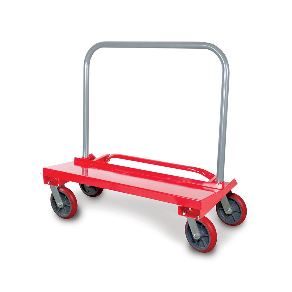 Drywall cart equipped with four 8 in. (20 cm) high capacity casters, 3 swivel and one with directional lock system, for ease of movement in straight lines. Can also be used as a flat cart to carry bulky loads.
