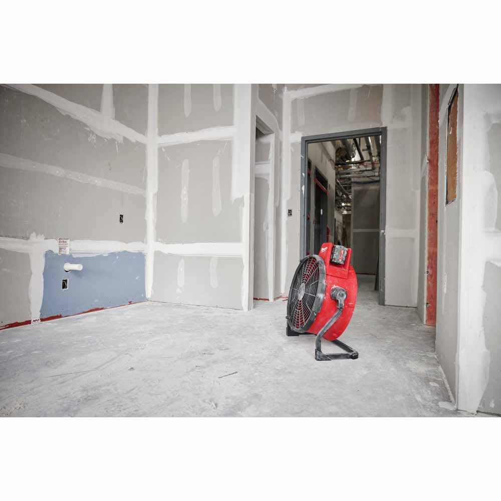 The MILWAUKEE M18™ Brushless 18” Fan delivers corded performance anywhere on the job site, providing air circulation over 50 ft and up to 13.5 MPH. The 18-inch blade and brushless motor quickly propels air, allowing for fast and efficient cooling, drying, or ventilation. The reinforced metal base and shroud design withstands demanding job site environments and delivers impact, water, and dust resistance. This lightweight, mobile fan can adapt to any location with 360 degrees of rotation and 5 hours of use on high with the M18™ HD12.0. The integrated AC plug offers the versatility to plug in a standard extension cord for extended runtime. For optimized storage and transportation, this fan has an interlocking stackable design. The new M18™ Brushless 18” Fan delivers CORDED PERFORMANCE. DURABLE COOLING. TOTAL MOBILITY.