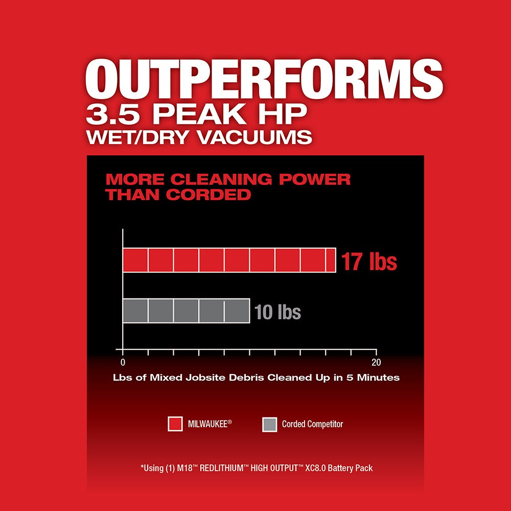 The MILWAUKEE M18 FUEL 6 Gallon Wet/Dry Vacuum brings unmatched performance, durability, and versatility to jobsite cleanup. The POWERSTATE Brushless Motor and optimized components Outperform 3.5 Peak HP Wet/Dry Vacuums, delivering more cleaning power than corded. The wet/dry vac cleans up more common jobsite debris like drywall dust, concrete dust, and wood/metal shavings than 3.5 peak HP wet/dry vacuums in the same amount of time. This wet/dry vacuum provides the Most Durable Wheels and Hoses with reinforced casters and tread design for up to 8X wheel life. The crush and twist-resistant hose construction deliver up to 2X hose life. This vac is part of the Most Versatile Wet/Dry Vacuum System with interchangeable motor heads, tanks, and carts for varying performance, holding capacity, and mobility with the easy access foot pedal. MAX POWER MODE delivers up to 31 minutes of continuous cleaning time (up to 1,000 ft) per charge on an M18 REDLITHIUM HIGH OUTPUT HD12.0 Battery Pack. MAX RUN-TIME MODE delivers up to 47 minutes of continuous cleaning time (up to 1,300 ft) per charge on an HD12.0 Battery Pack. The included Large High-Efficiency Filter ensures optimal dust and microparticle collection. Milwaukee Fleece Dust Bags can be used for less debris build-up on the filter. Integrated accessory storage allows for easy access to the crevice tool and utility nozzle on the motorhead, with more accessory storage spots on the removable wet/dry vacuum cart.