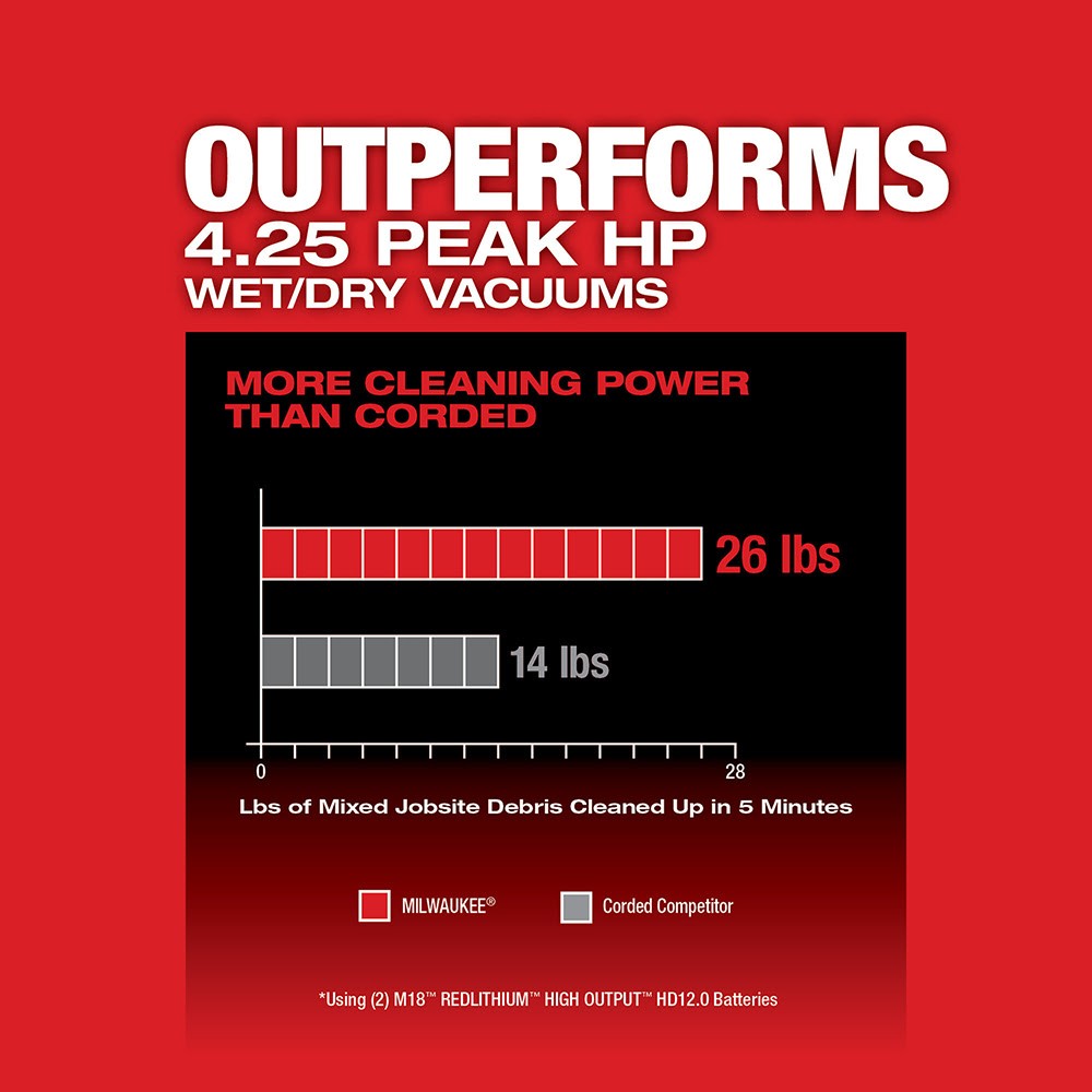 The MILWAUKEE M18 FUEL 12 Gallon Dual-Battery Wet/Dry Vacuum brings unmatched performance, durability, and versatility to jobsite cleanup. The POWERSTATE Brushless Motor and optimized components Outperform 4.25 Peak HP Wet/Dry Vacuums, delivering more cleaning power than corded. The Dual-Battery Motor Head requires (2) batteries (included) to operate and cleans up more common jobsite debris like drywall dust, concrete dust, and wood/metal shavings than 4.25 peak HP wet/dry vacs in the same amount of time. This cordless vac provides the Most Durable Wheels and Hoses with reinforced casters and tread design for up to 8X wheel life. The crush and twist-resistant hose construction delivers up to 2X hose life. This vac is part of the Most Versatile Wet/Dry Vacuum System with interchangeable motor heads, tanks, and carts for varying performance, holding capacity, and mobility with the easy access foot pedal. MAX POWER MODE delivers up to 34 minutes of continuous cleaning time (up to 1,600 ft) and up to 49 minutes (up to 1,800 ft) on MAX RUN-TIME MODE per charge on (2) M18 REDLITHIUM HIGH OUTPUT HD12.0 Battery Packs. The removable telescoping handle increases mobility with three adjustable heights. The included Large High-Efficiency Filter ensures optimal dust and microparticle collection. Cart accessory storage allows for easy access to accessories when needed.