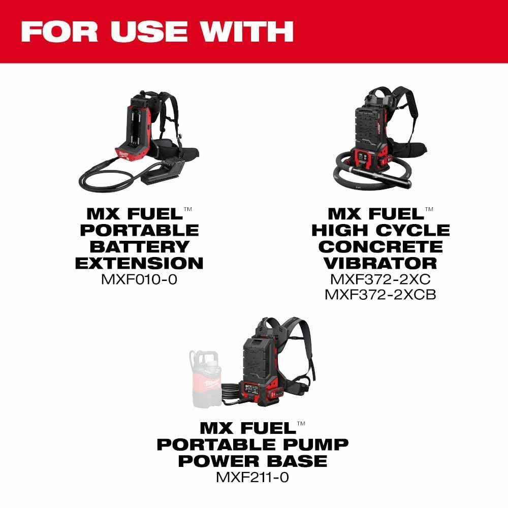 - For use with MX FUEL Portable Battery Extension (MXF010-0), MX FUEL Backpack High Cycle Concrete Vibrator (MXF372-2XCB), MX FUEL Portable Pump Power Base (MXF211-0)